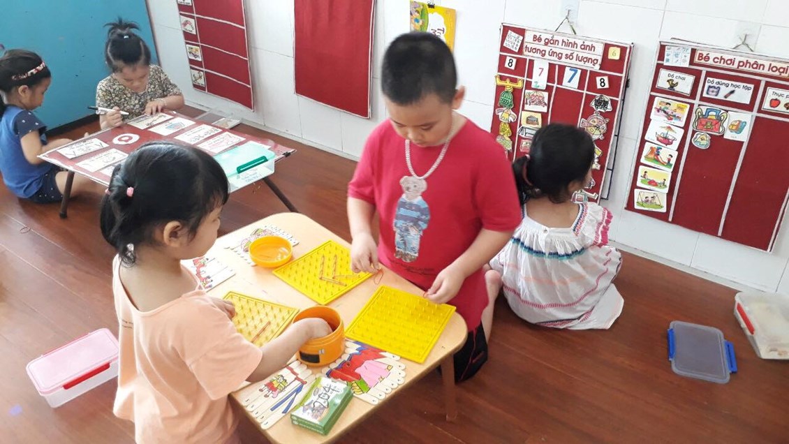 Góc học tập: trẻ tái tạo lại những gì đã được cô dạy trẻ trên tiết học nhằm tạo cho trẻ sự ghi nhớ vững bền hơn. Và tư duy trừu tượng phát triển kèm theo tư duy logic, tư duy ngôn ngữ cũng phát triển.