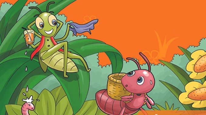 Châu chấu cất giọng rủ rê: “Bạn kiến ơi, thay vì làm việc cực nhọc, chi bằng bạn hãy lại đây trò truyện và đi chơi thỏa thích cùng tớ đi!” Kiến trả lời “Không, tớ bận lắm, tớ còn phải đi kiếm thức ăn để dự trữ cho mùa đông sắp tới. Bạn cũng nên làm như vậy đi bạn châu chấu ạ”.